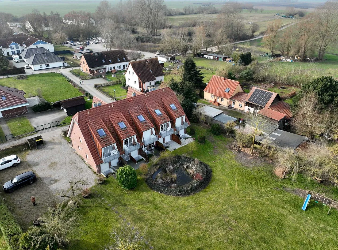 Schöne Terrassen/ Balkone mit Blick in den herrlichen Garten mit Teich laden zum genießen der Poeler Sonne ein.