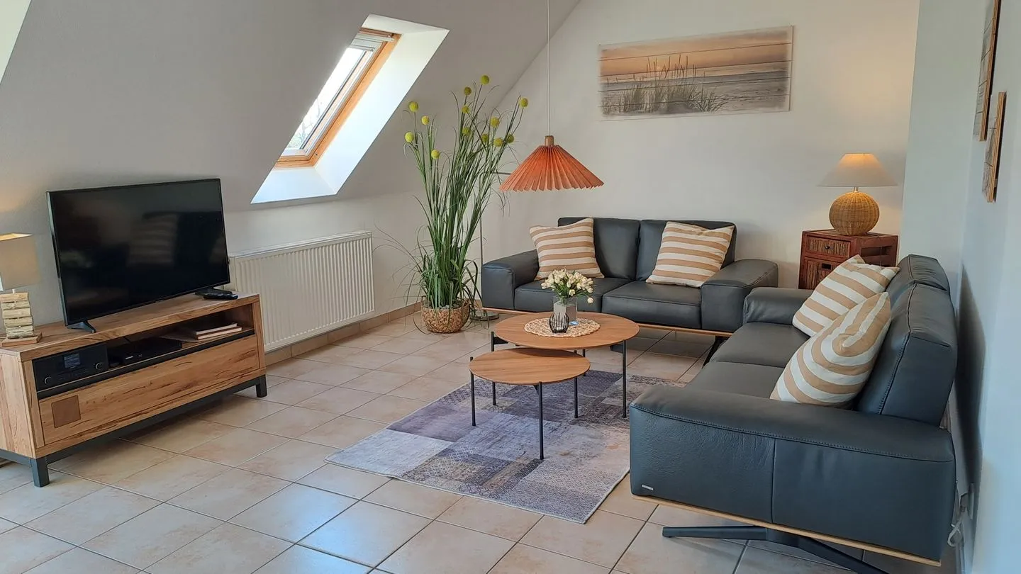 Welcome to the "Meeresbrise" apartment! This charming apartment is located directly on the beach of Schwarzer Busch and offers a unique location for your vacation. The apartment extends over two levels and has a cozy living room, a bedroom, and a bathroom on the lower level. The second bedroom is located in the attic and is equipped with an additional TV. Both bedrooms have comfortable double beds and can accommodate up to four people. The balcony does not offer direct sea views but still provides a beautiful view of the surroundings. The bathroom is equipped with a shower and a toilet. For families with young children, the landlord is happy to provide a cot and a high chair. We look forward to welcoming you to Meeresbrise! Free Wi-Fi is available. Only dogs allowed! Non-smoking apartment!